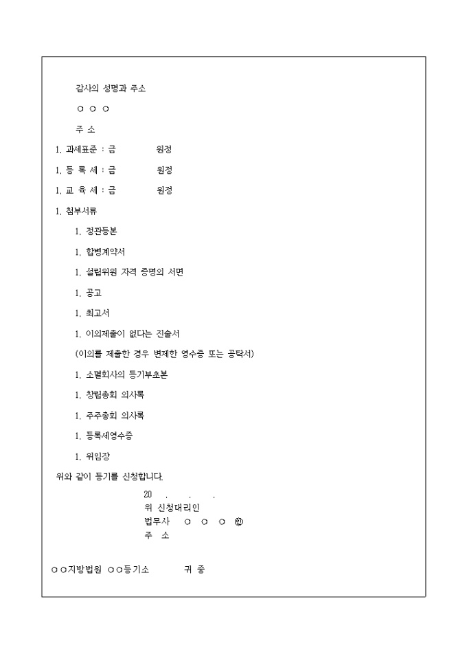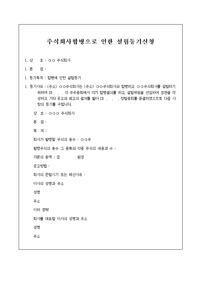 9,000원/월다른 회사를 합병하고 주식회사를 설립하기 위하여 각 주주총회에서 각기 합병결의를 하고, 설립위원을 선임하여 정관을 작성하고 기타 공고와 최고의 절차를 밟아 창립총회를 종결하였으므로 그 등기를 구한다는 내용의 양식입니다.