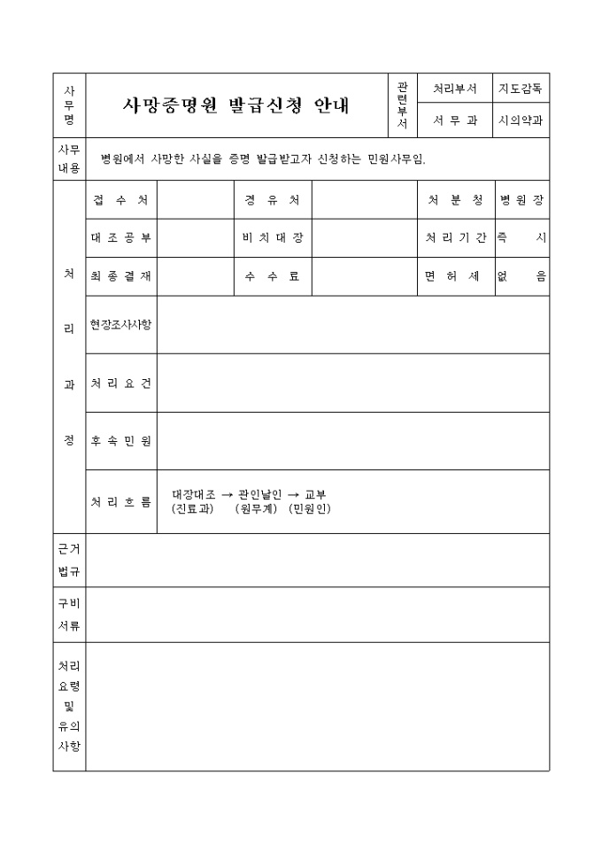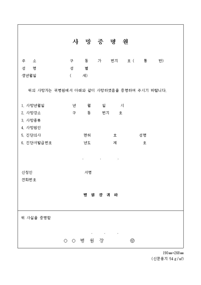 9,000원/월사망자가 특정병원에서 사망하였음을 해당병원에 증명요청할 때 사용하는 양식으로 사망증명원 발금신청 안내양식이 첨부되어 있습니다.