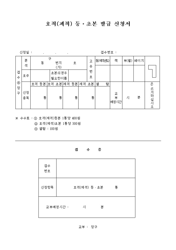 호적(제적)등·초본발급을 신청할 때 사용하는 양식으로 본적, 호주, 신청종목등을 기입합니다. 접수증도 첨부되어 있습니다.