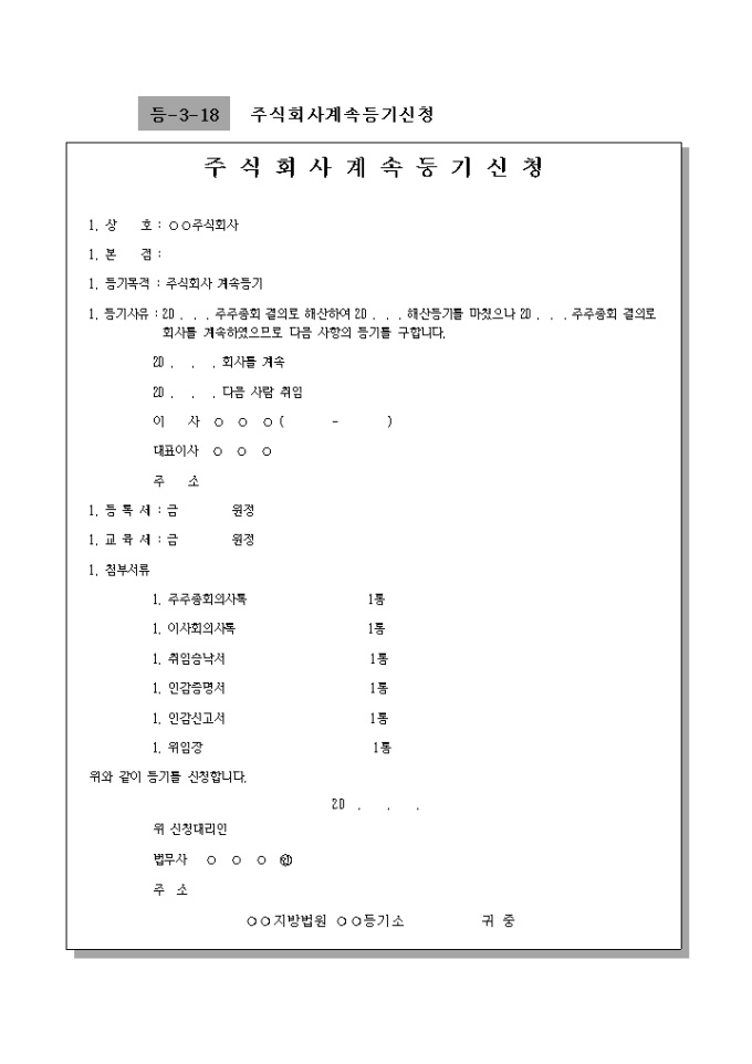 1. 등기사유 : 20 . . . 주주총회 결의로 해산하여 20 . . . 해산등기를 마쳤으나 20 . . . 주주총회 결의로 회사를 계속하였으므로 다음 사항의 등기를 구합니다.