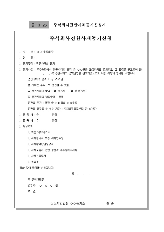 1. 등기사유 : 주주총회에서 전환사채의 총액 금 ○○원을 모집하기로 결의하고, 그 모집을 완료하여 20 . . . 각 전환사채의 전액납입을 완료하였으므로 다음 사항의 등기를 구합니다.