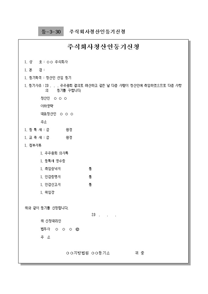 1. 등기사유 : 20 . . . 주주총회 결의로 해산하고 같은 날 다음 사람이 청산인에 취임하였으므로 다음 사항의 등기를 구합니다.