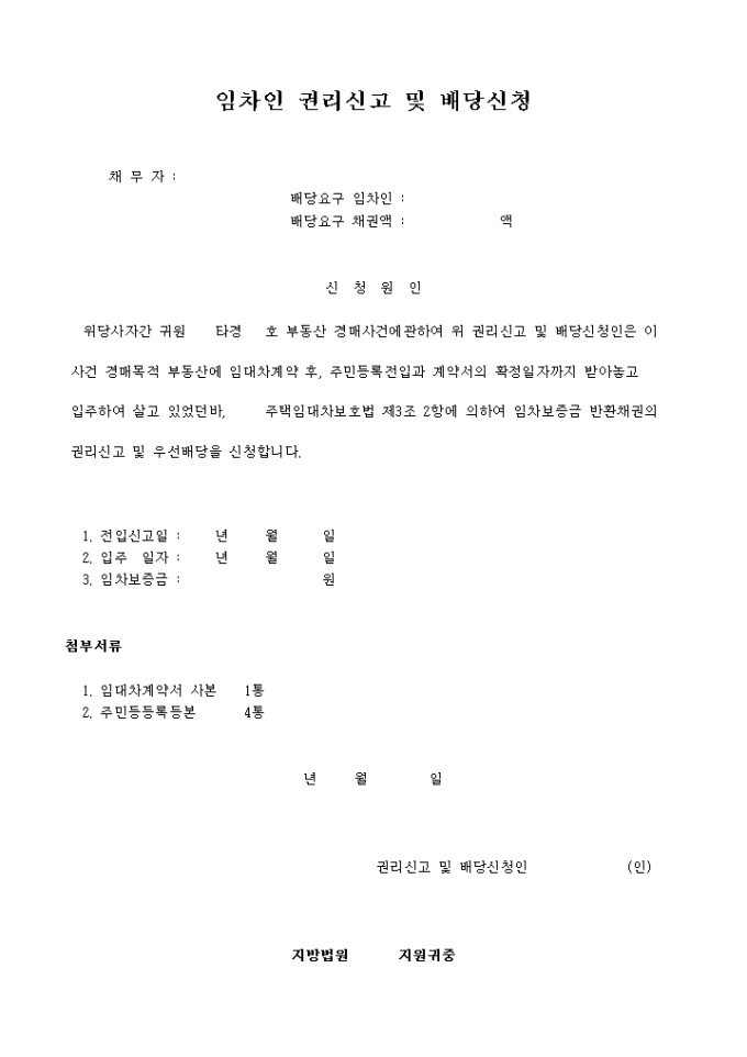 주택임대차보호법 제3조 2항에 의하여 임차보증금 반환채권의 권리신고 및 우선배당을 신청할때 사용하는 양식입니다.