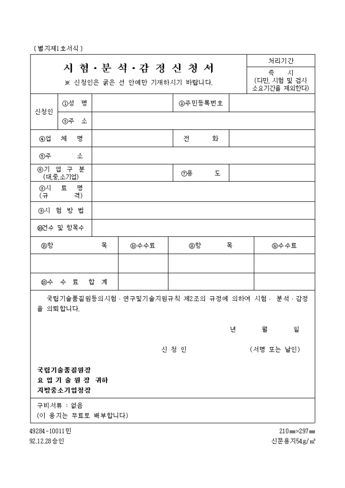 시험, 분석, 감정신청서