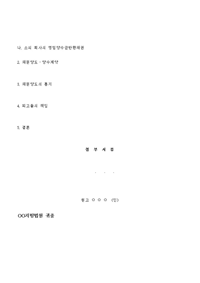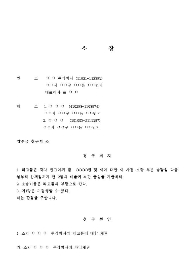 양수금청구에 관한 소장 양식입니다. 청구취지와 청구원인을 기재합니다.