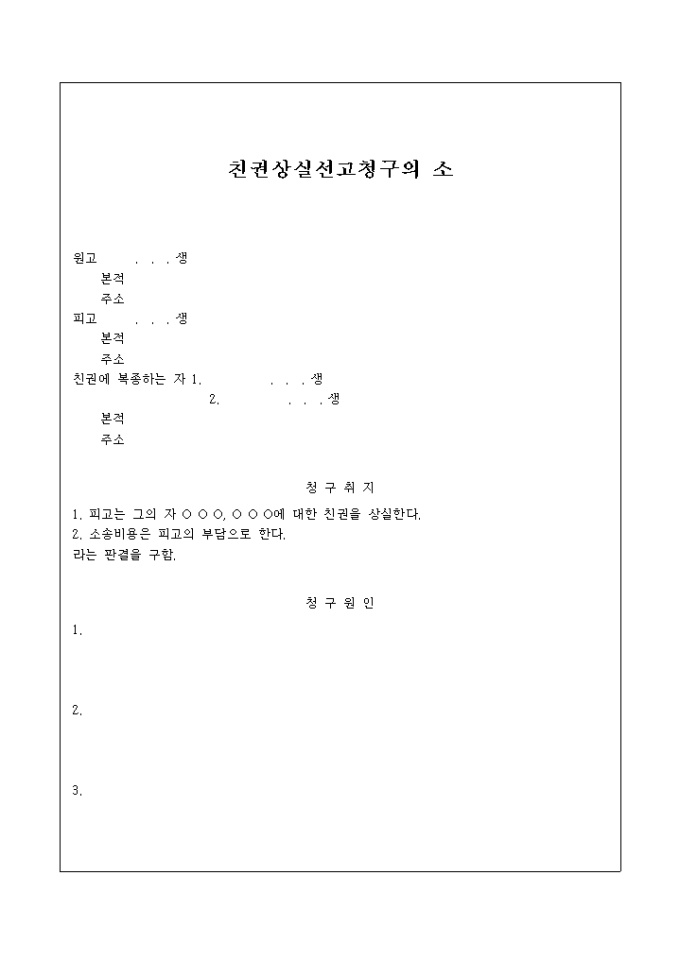 9,000원/월피고의 자식에 대한 친권의 상실을 요청할 때 사용하는 양식입니다.