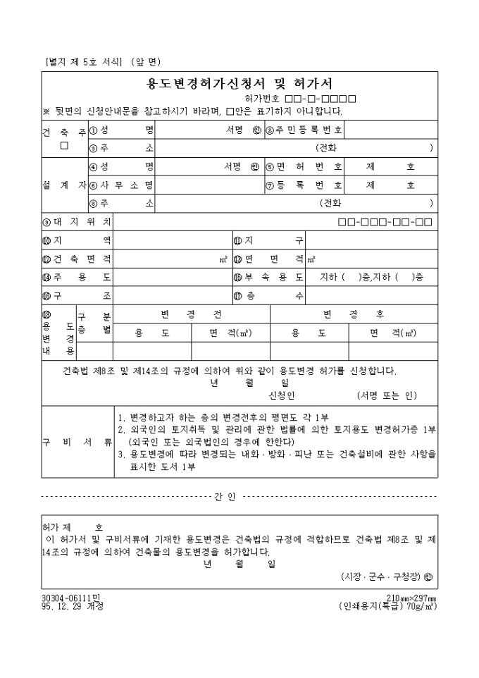 건축법 제8조 및 제14조의 규정에 의하여 용도변경 허가를 신청할 때 사용하는 양식입니다.