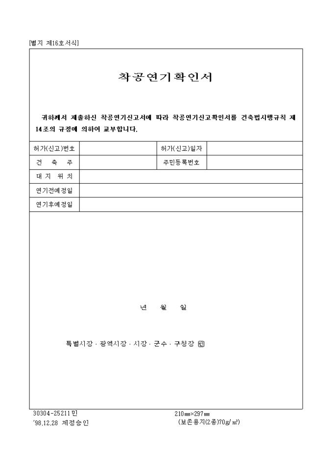 [별지 제16호서식] 착공연기신고서에 따라 착공연기신고확인서를 건축법시행규칙 제14조의 규정에 의하여 교부할 때 사용하는 양식입니다.