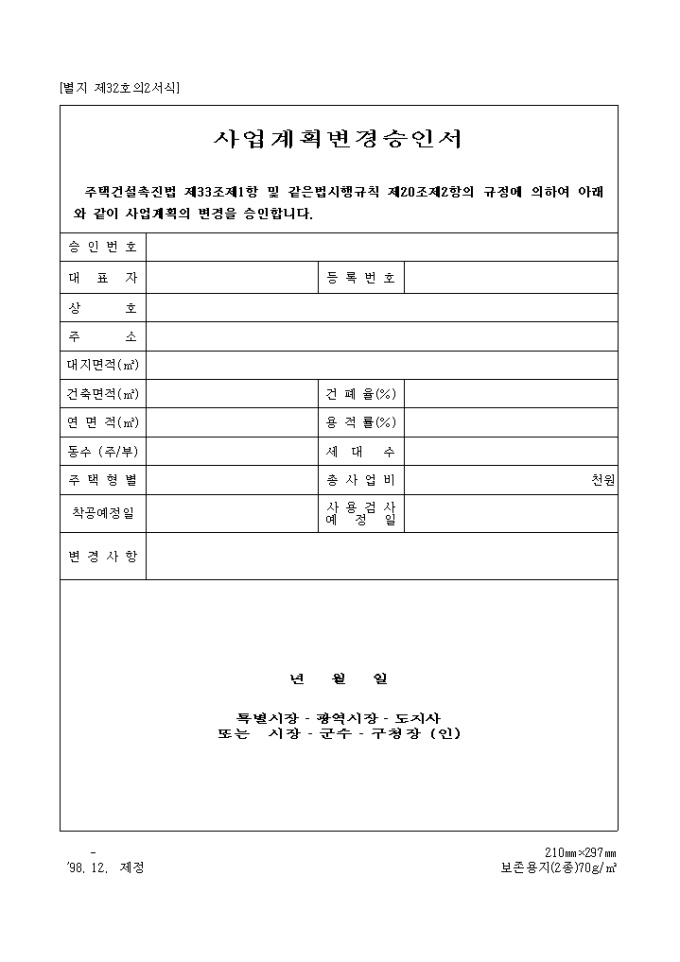 주택건설촉진법 제33조제1항 및 같은법시행규칙 제20조제2항의 규정에 의하여 사계획의 변경을 승인할 때 사용하는 양식입니다.