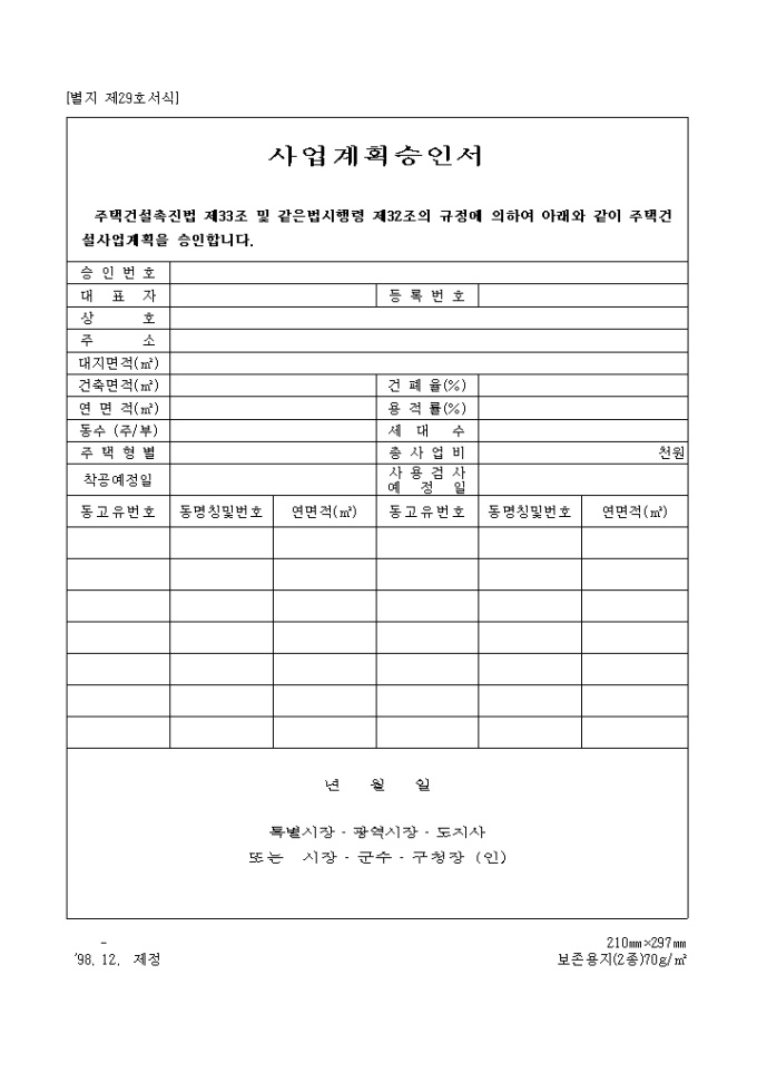9,000원/월[별지 제29호서식] 주택건설촉진법 제33조 및 같은법시행령 제32조의 규정에 의하여 주택건설사업계획을 승인할 때 사용하는 양식입니다.
