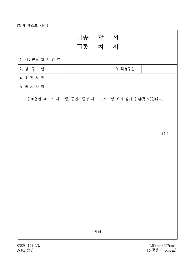 고용보험법과, 동법시행령에 의해 송달(통지)할 때 사용하는 양식입니다.