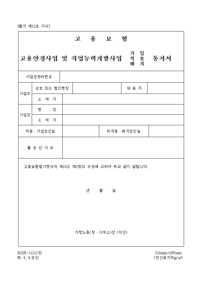 고용보험법시행규칙 제10조 제2항의 규정에 의하여 고용보험 고용안정사업 및 직업능력개발 사업을 통지할 때 사용하는 양식입니다.