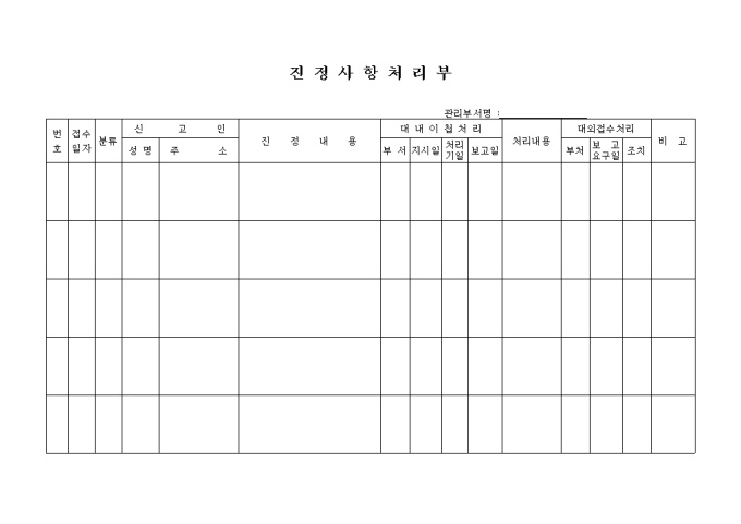 9,000원/월신고인, 진정내용, 대내이첩처리, 처리내용, 대외접수내용으로 구성된 진정사항처리부 양식입니다.