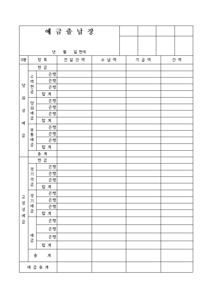 9,000원/월당좌성예금, 고정성예금으로 분류하여 전일잔액, 수납액, 지급액, 잔액을 기록하는 예금출납장 양식입니다.