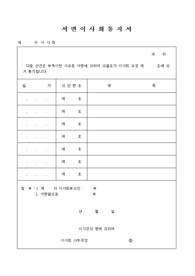 부득이한 사유로 서면에 의하여 의결코자 이사회 규정에 의거 통지하는 양식입니다.