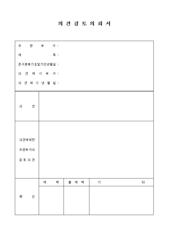 9,000원/월의뢰하는 의견내용과 이에 대한 주관부서의 검토의견을 기록하는 양식입니다.