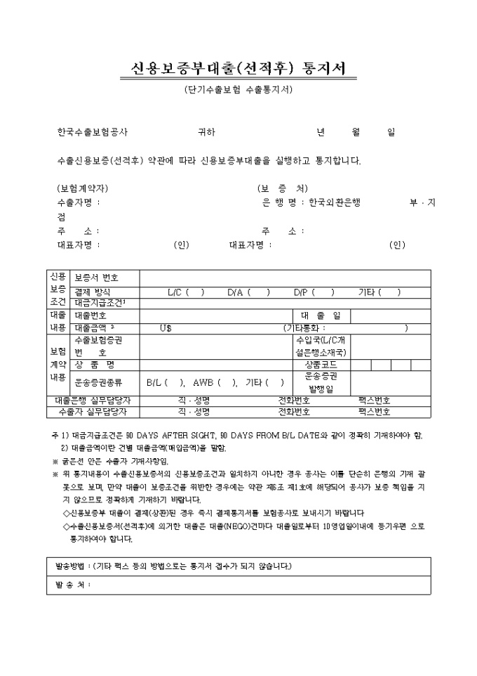 9,000원/월신용보증대출통지서 양식입니다. 위 통지내용이 수출신용보증서의 신용보증조건과 일치하지 아니한 경우 공사는 이를 단순히 은행의 기재 잘못 으로 보며, 만약 대출이 보증조건을 위반한 경우에는 약관 제6조 제1호에 해당되어 공사가 보증 책임을 지지 않으므로 정확하게 기재하기 바랍니다. ◇신용보증부 대출이 결제(상환)된 경우 즉시 결제통지서를 보험공사로 보내시기 바랍니다 ◇수출신용보증서(선적후)에 의거한 대출은 대출(NEGO)건마다 대출일로부터 10영업일이