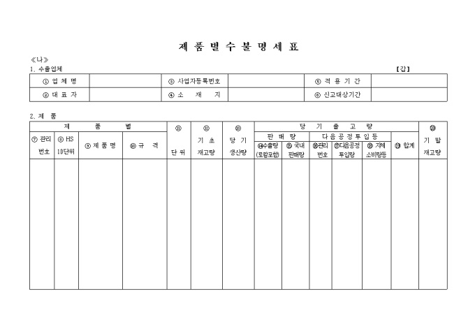 9,000원/월제품별수불명세표 양식입니다. 제품별, 당기출고량의 세부항목으로 구성된 제품수불명세표 양식입니다.