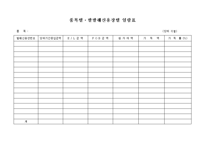 품목별·발발췌신용장별일람표 양식입니다. 발췌신용장번호, 단위기간중입금액, E/L금액, FOB금액등으로 구성된 품목별발발췌신용장별일람표입니다.