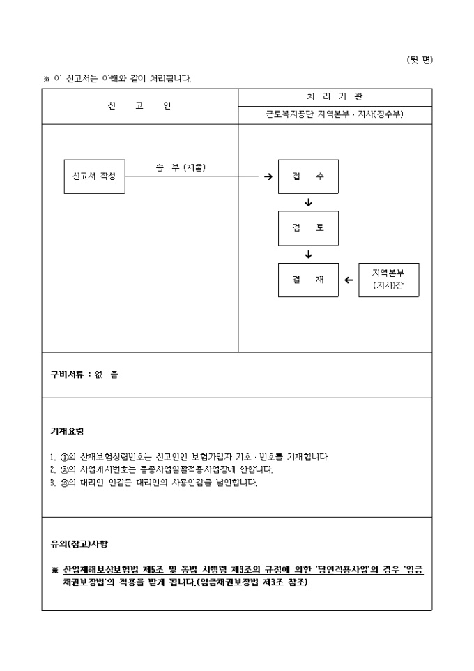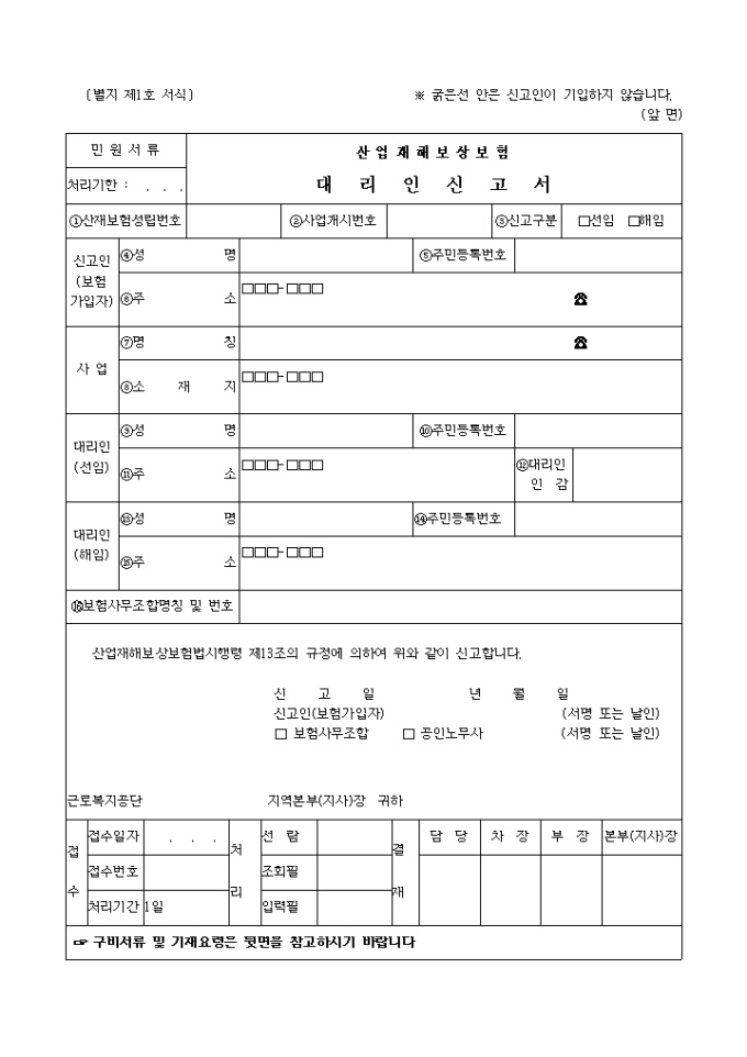 9,000원/월[별지 제1호 서식] 대리인신고서대리인신고서 양식입니다. 산업재해보상보험법시행령 제13조의 규정에 의하여 위와 같이 신고하실때 사용하는 양식입니다.