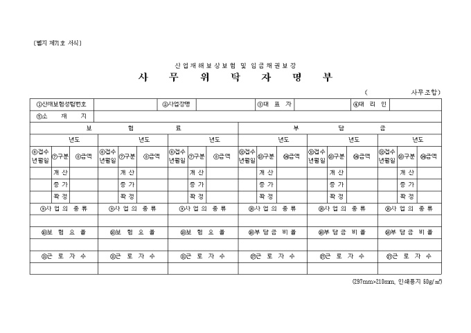 [별지 제71호 서식] 산업재해보상보험 및 임금채권보장 사무위탁자명부 양식입니다. 사업장별 년간 보험료내역과 부담금내역등의 항목으로 구성된 양식입니다.