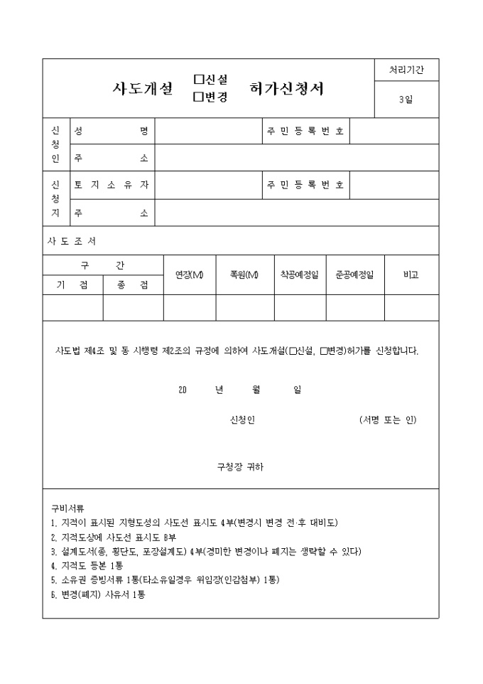 사도법 제4조 및 동 시행령 제2조의 규정에 의하여 사도개설(신설, 변경)허가를 신청할 때 사용하는 양식입니다.