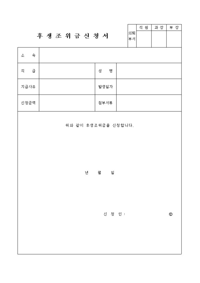 9,000원/월사원이 생활의 안정을 위해 조위금을 신청하는 양식입니다.