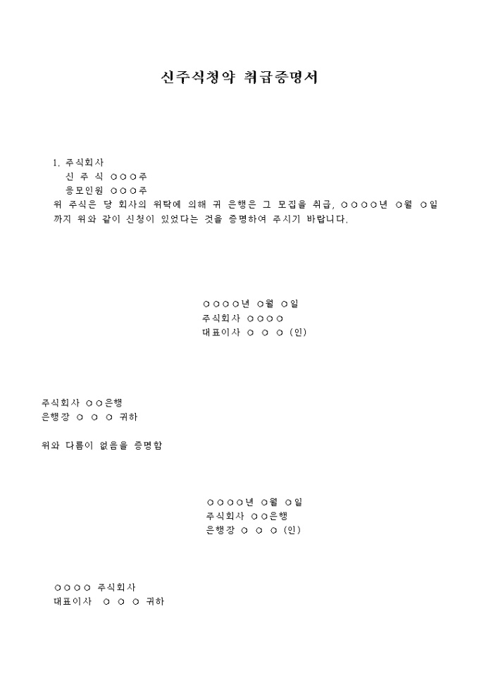 주식을 회사의 위탁에 의해 은행이 모집을 특정기간까지 신청하였다는 것에 대한 증명을 요청하고 그 사실을 은행이 증명해 주는 양식입니다.
