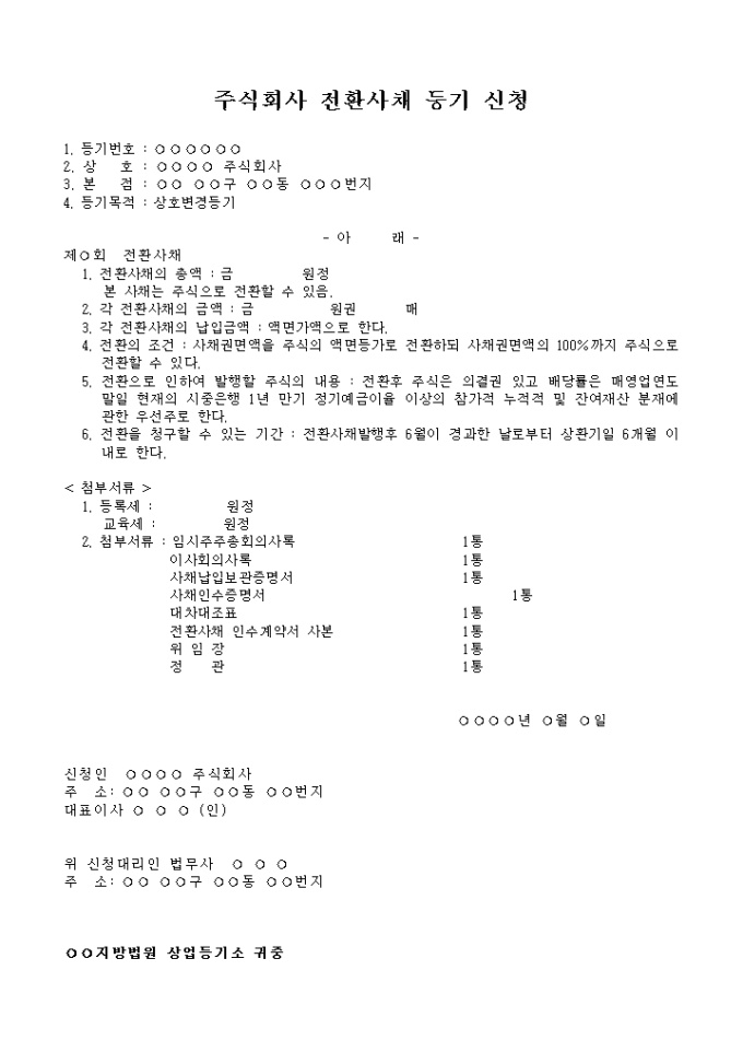 전환 사채의 총액과 금액 납입금액 전환의 조건으로 인하여 발행할 주식의 내용 전환을 청구할 수 있는 기간 등에 대한 등기 신청의 양식입니다.