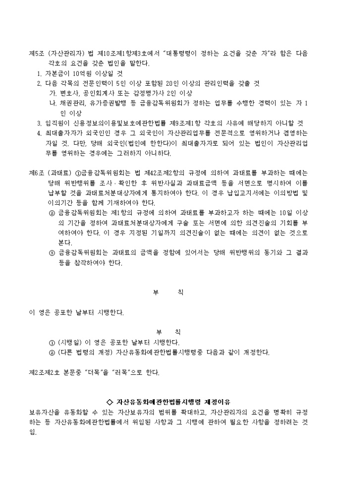제1조(목적) 이 영은 자산유동화에관한법률에서 위임된 사항과 그 시행에 관하여 필요한 사항을 규정함을 목적으로 한다.