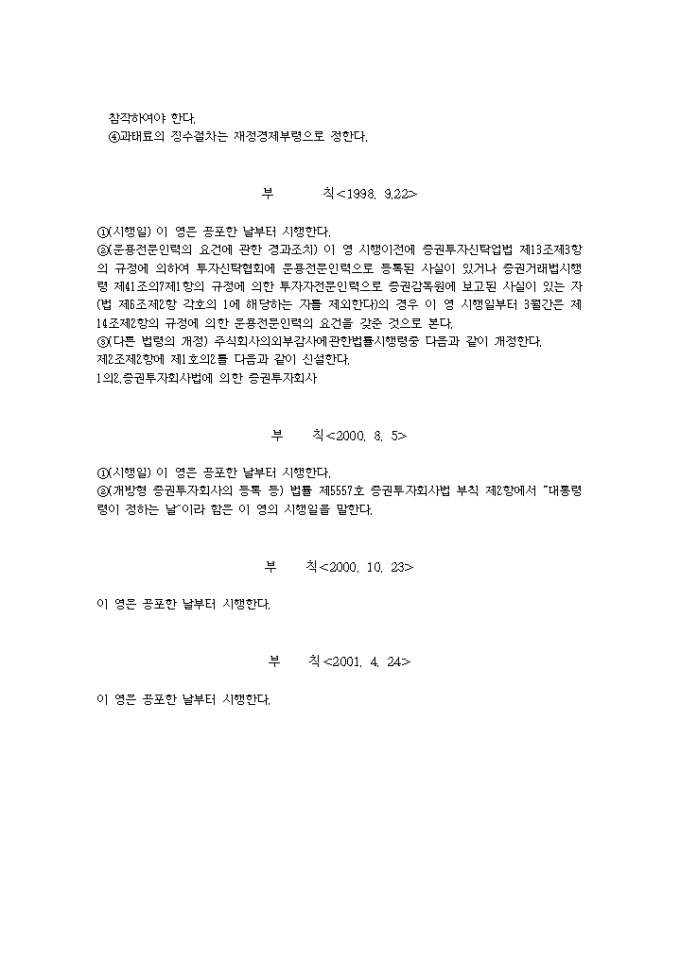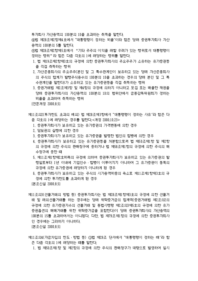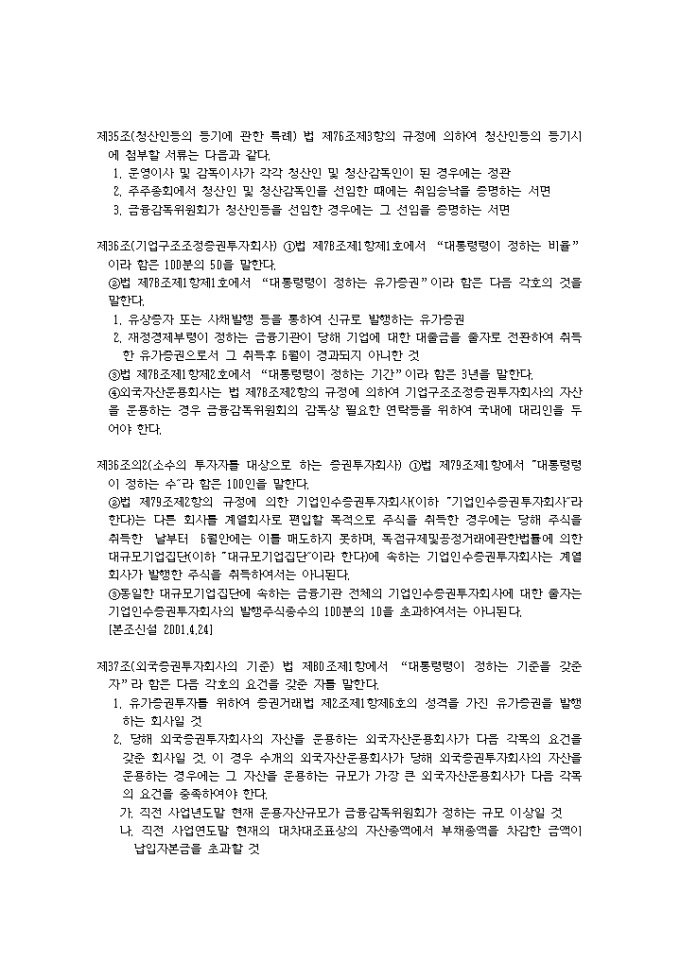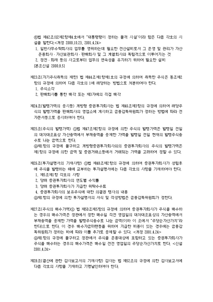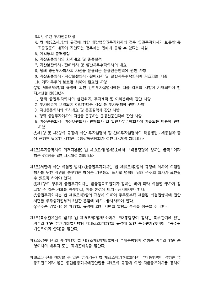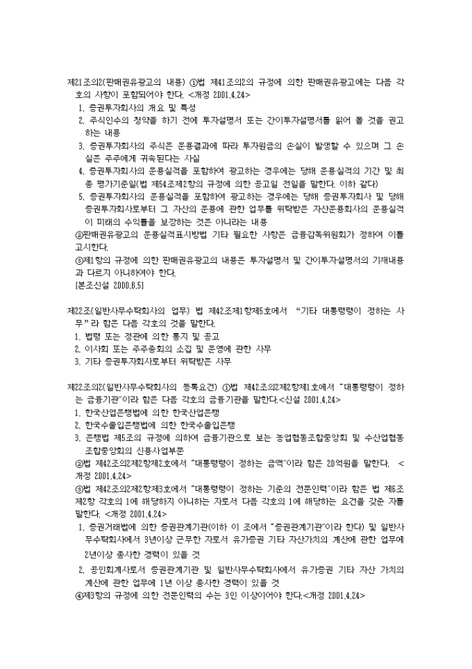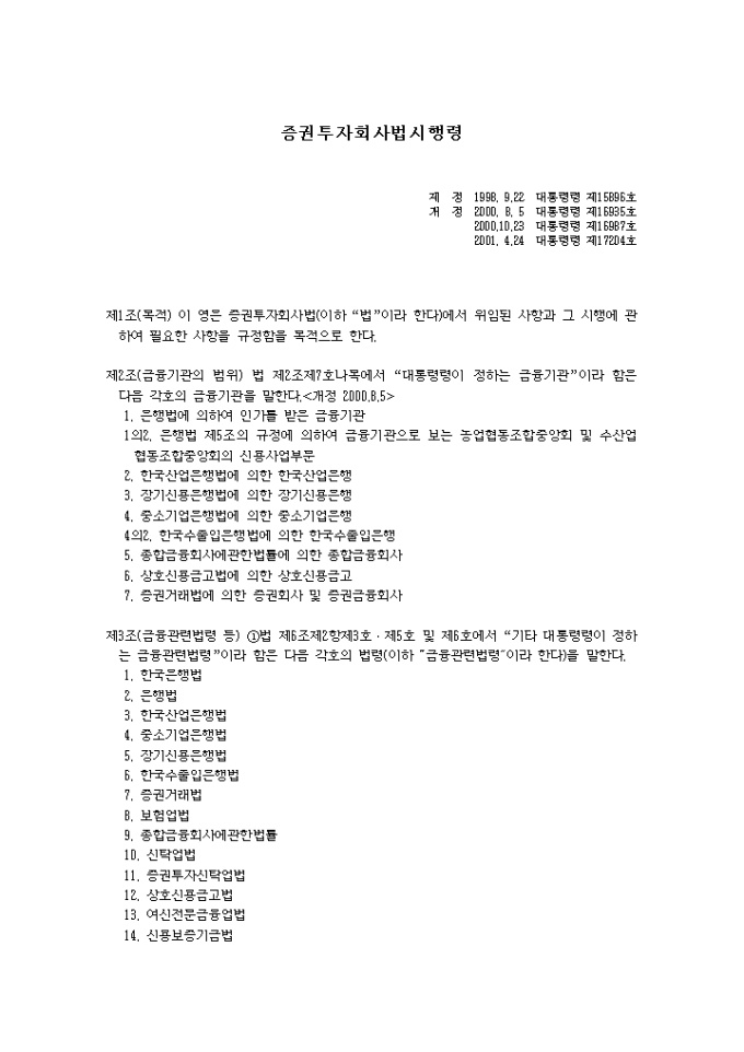 9,000원/월증권투자회사법시행령(2001.04.24) 입니다. 제1조(목적) 이 영은 증권투자회사법(이하 “법”이라 한다)에서 위임된 사항과 그 시행에 관하여 필요한 사항을 규정함을 목적으로 한다. 제2조(금융기관의 범위) 법 제2조제7호나목에서 “대통령령이 정하는 금융기관”이라 함은 다음 각호의 금융기관을 말한다.<개정 2000.8.5> 1. 은행법에 의하여 인가를 받은 금융기관 1의2. 은행법 제5조의 규정에 의하여 금융기관으로 보는