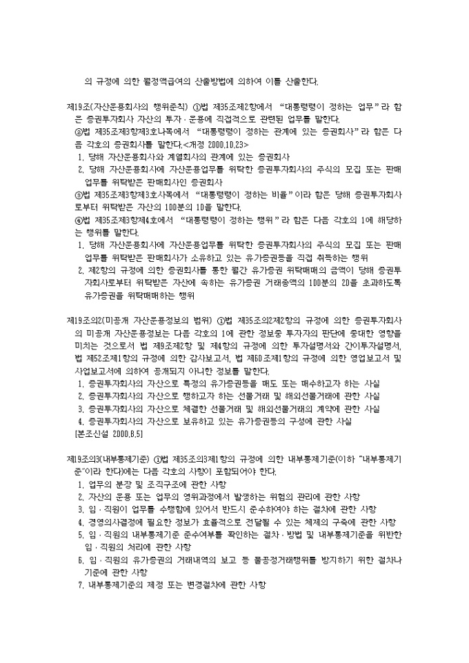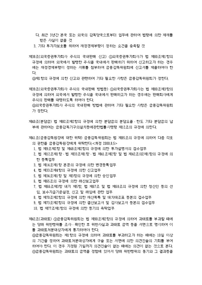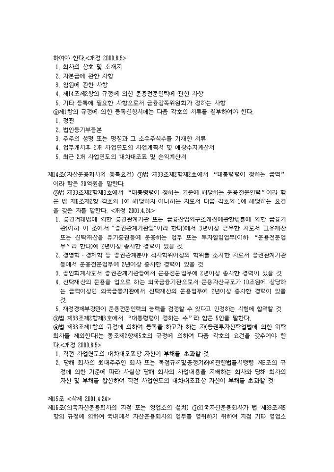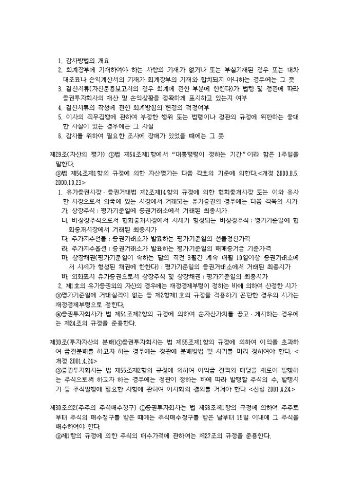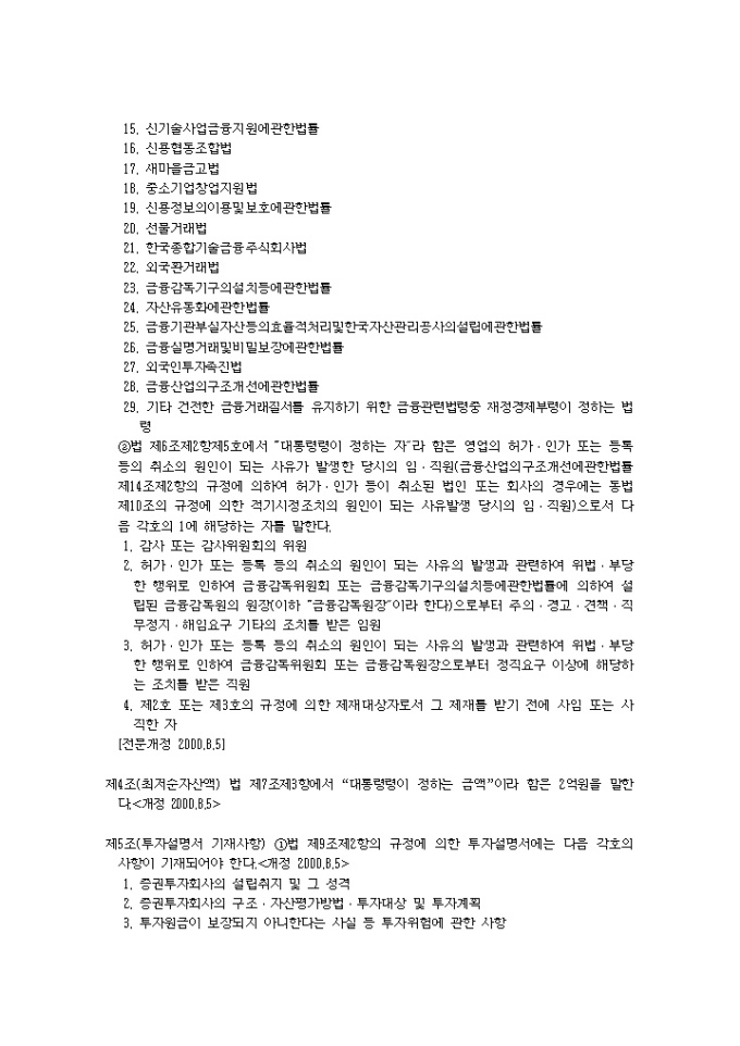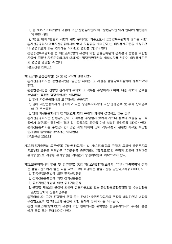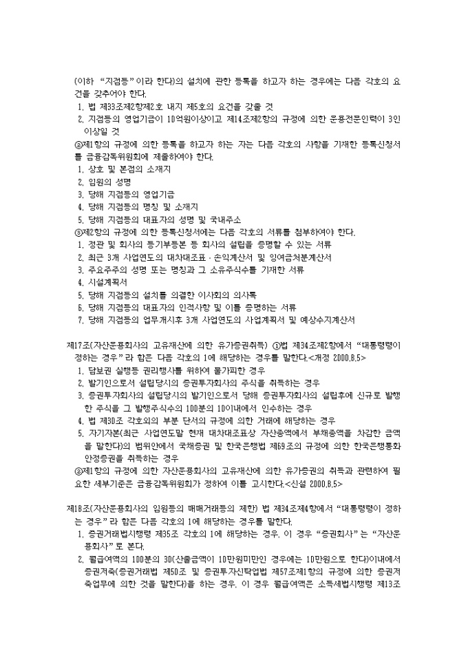 9,000원/월증권투자회사법시행령(2001.04.24) 입니다. 제1조(목적) 이 영은 증권투자회사법(이하 “법”이라 한다)에서 위임된 사항과 그 시행에 관하여 필요한 사항을 규정함을 목적으로 한다. 제2조(금융기관의 범위) 법 제2조제7호나목에서 “대통령령이 정하는 금융기관”이라 함은 다음 각호의 금융기관을 말한다.<개정 2000.8.5> 1. 은행법에 의하여 인가를 받은 금융기관 1의2. 은행법 제5조의 규정에 의하여 금융기관으로 보는