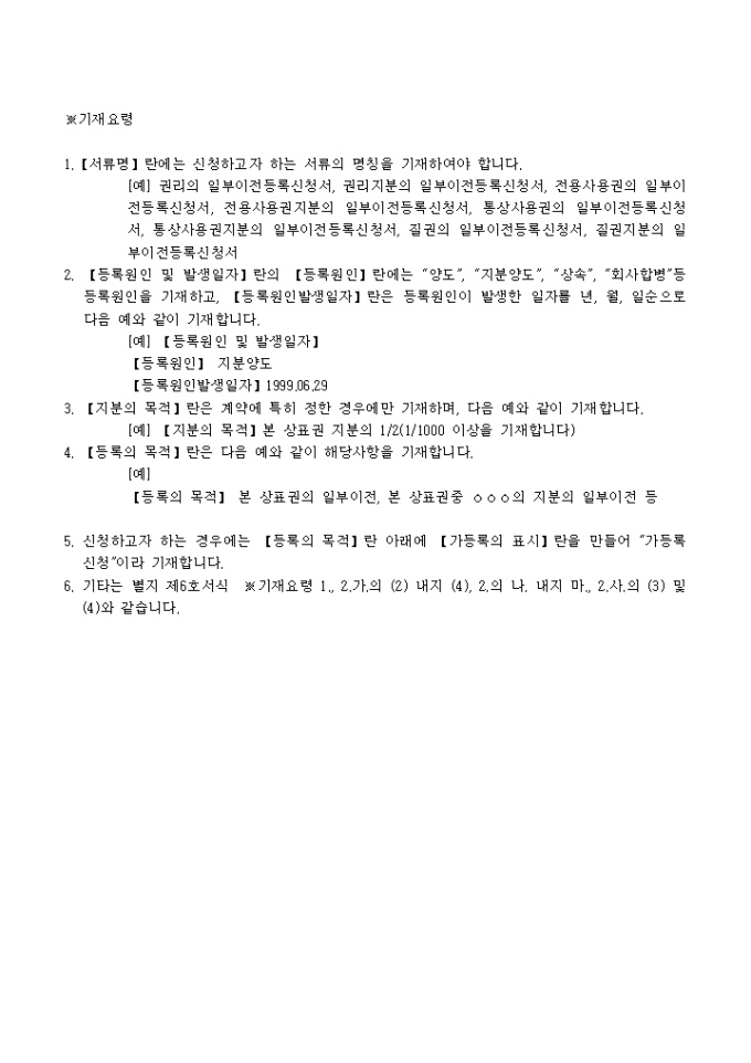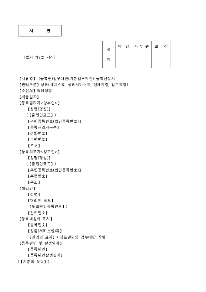 9,000원/월상표(서비스표,단체표장,업무표장)(등록권)일부이전(지분일부이전)등록신청서 양식 예제입니다.