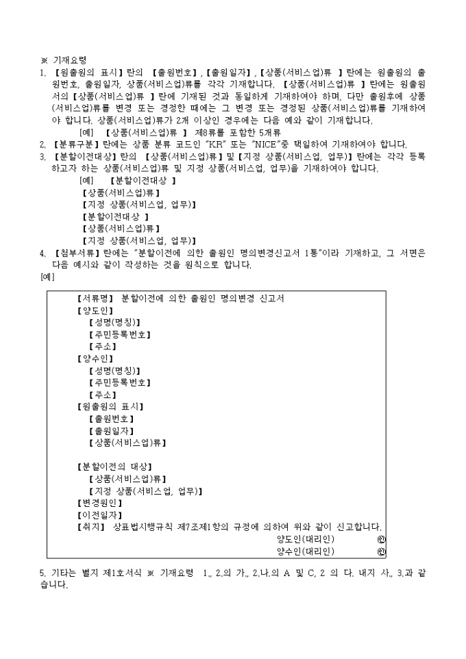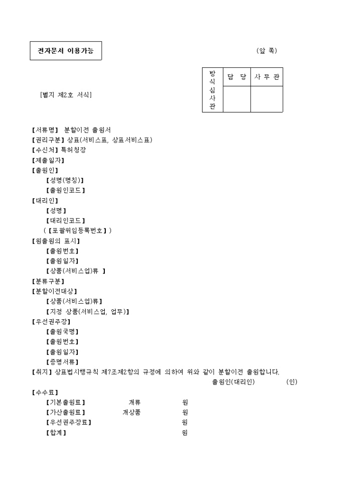 9,000원/월상표(서비스표,상표서비스표)분할 이전출원서 양식 예제입니다.
