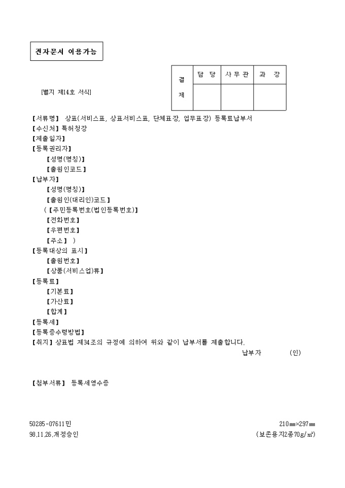 상표(서비스표, 상표서비스표, 단체표장, 업무표장)등록료납부서