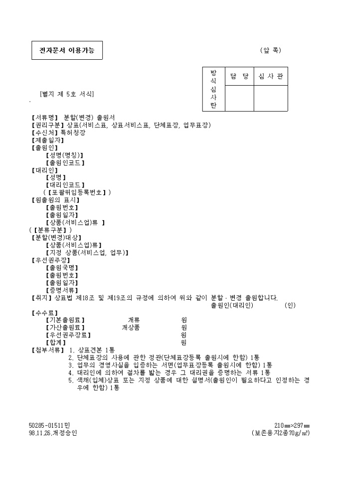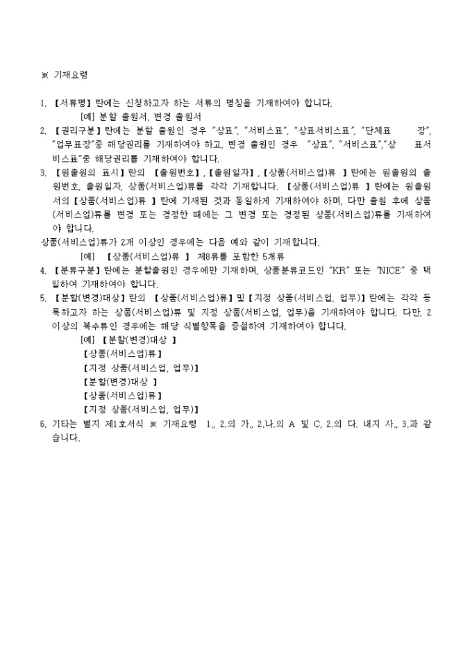 9,000원/월상표(서비스표,상표서비스표,단체표장,업무표장) 분할(변경) 출원서 양식 예제입니다.