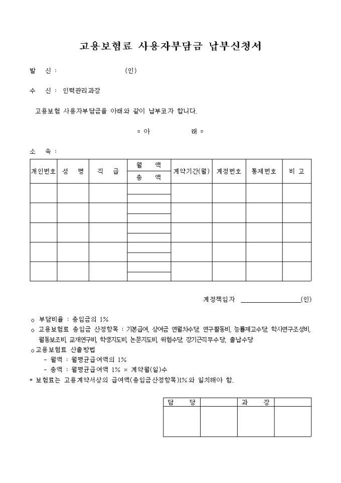 9,000원/월개인번호,성명,직급,월(총)액,계약기간,계정번호,통제번호 등을 기재하는 고용보험료사용자부담금납부신청서입니다.