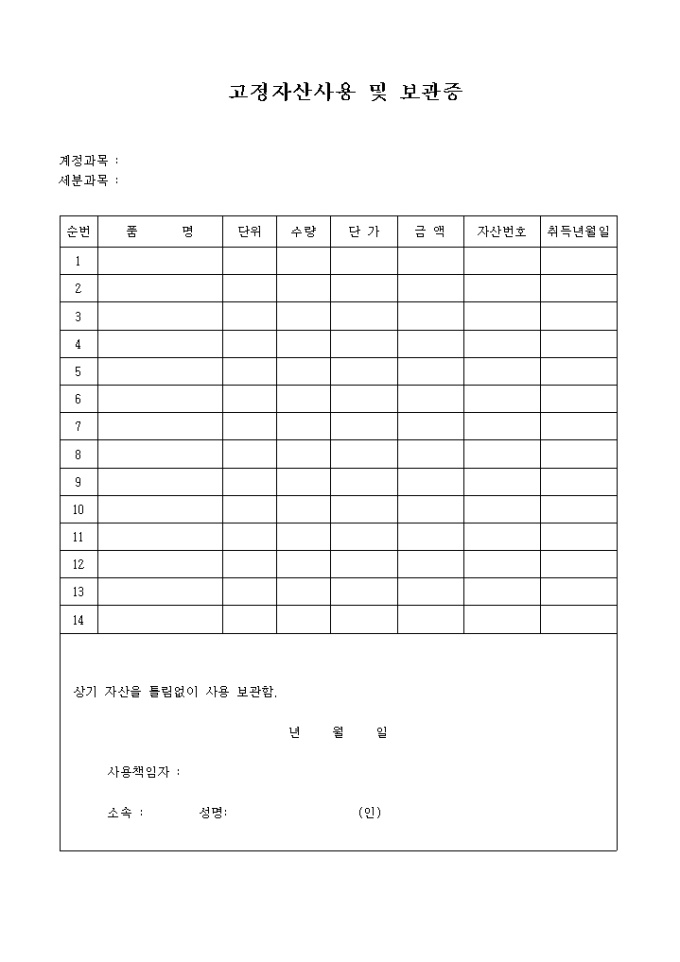 9,000원/월품명,단위,수량,단가,금액,자산번호,취득년월일을 기록하는 고정자산사용 및 보관증입니다.