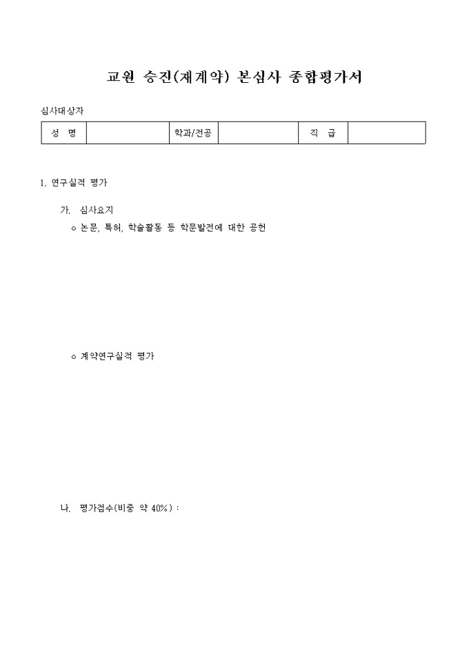 논문, 특허, 학술활동 등 학문발전에 대한 공헌, 계약연구실적 평가를 기재한는 교원승진(재계약)본심사종합평가서입니다.
