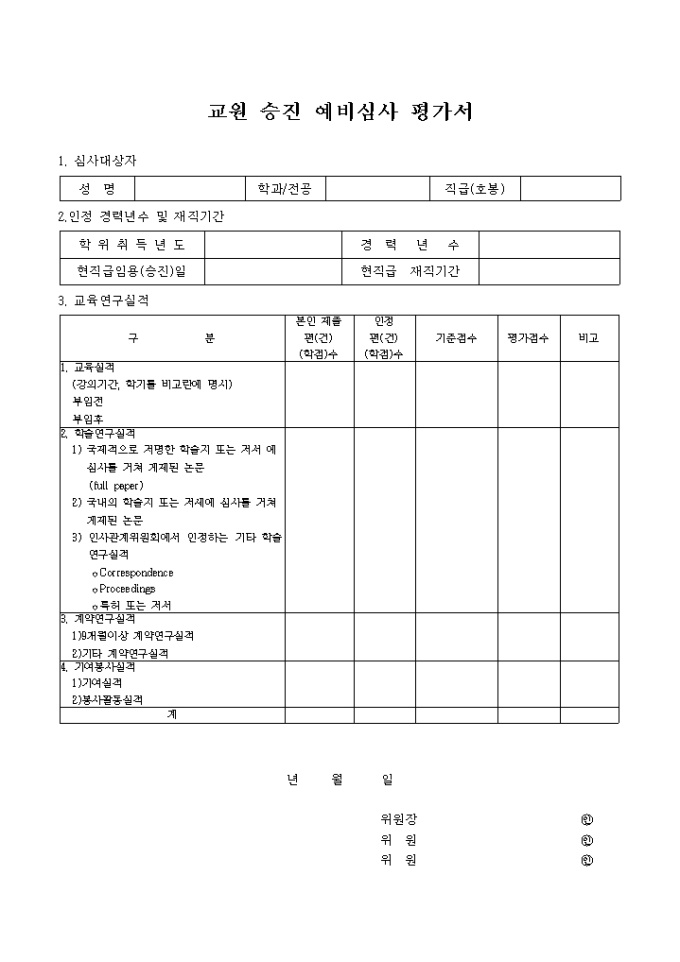 9,000원/월심사대상자의 성명, 학과/전공, 직급, 이정 경력년수 및 재직기간, 교육연구실적을 기재하는 교원승진예비심사평가서입니다.