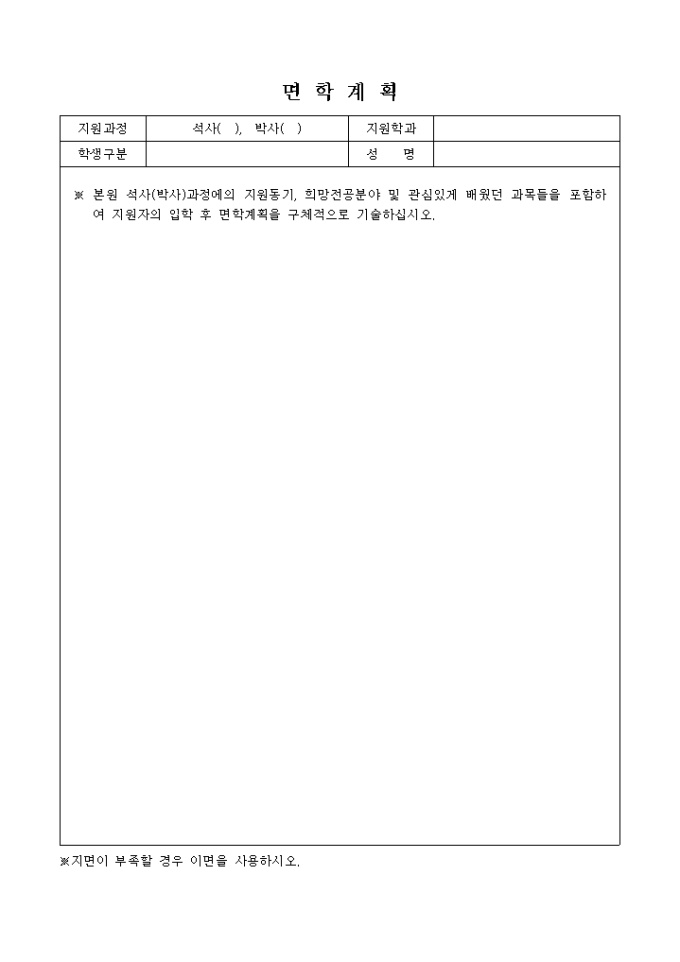 석사(박사)과정에의 지원동기,희망전공분야 및 관심있게 배웠던 과목,입학 후 면학계획을 기술하는 양식입니다.