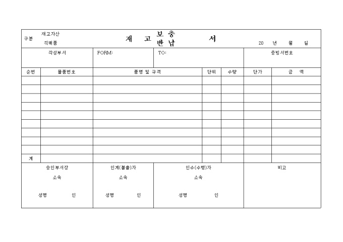 9,000원/월재고품의 내역을 기재하는 재고 보충 및 반납서입니다.