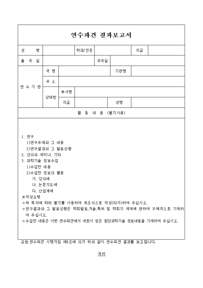 9,000원/월연구내용,강의와 세마나,과학기술 정보수집에 관한 내용등을 기록하는 연수파견결과보고서입니다.