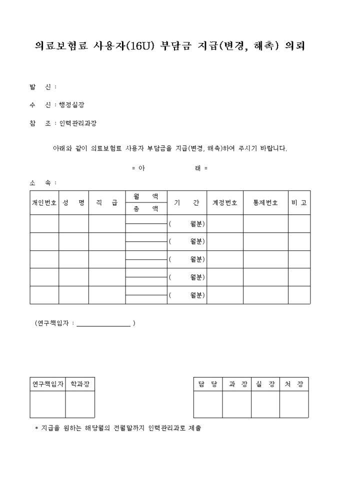 9,000원/월의료 보험료 사용 부담금의 변경,해촉을 의뢰할때 사용하는 양식입니다.