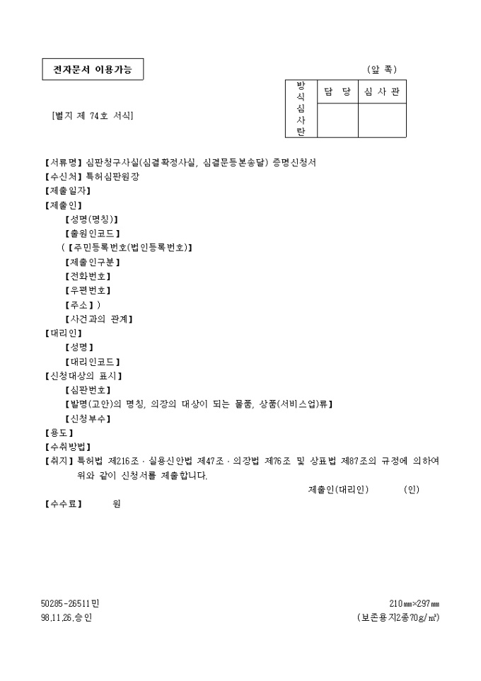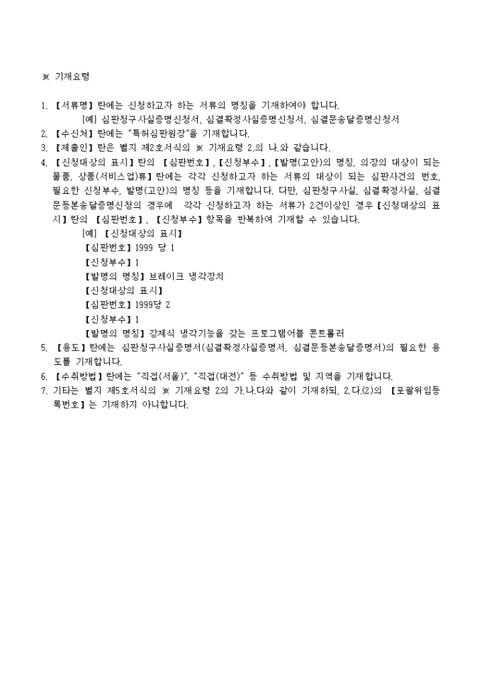 【취지】특허법 제216조․실용신안법 제47조․의장법 제76조 및 상표법 제87조의 규정에 의하여 위와 같이 신청서를 제출합니다.