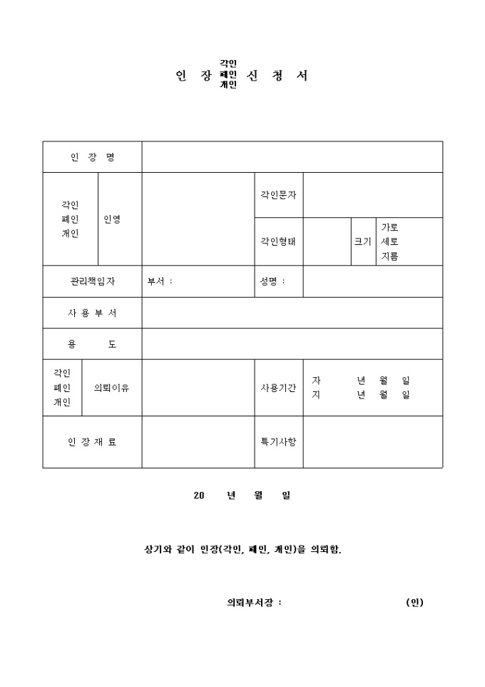 9,000원/월인장의 각인,폐인,개인신청을 할때 사용하는 양식입니다.