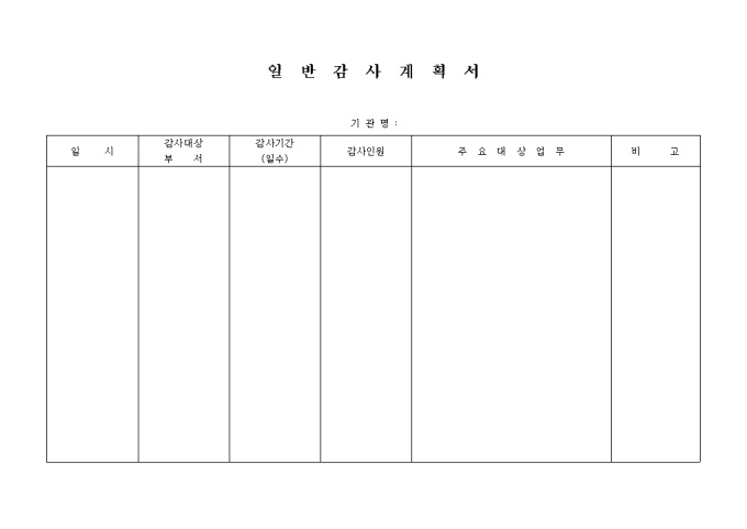 일시,감사대상부서,감사기간,감사인원,주요대상업무를 기록하는 일반감사계획서입니다.