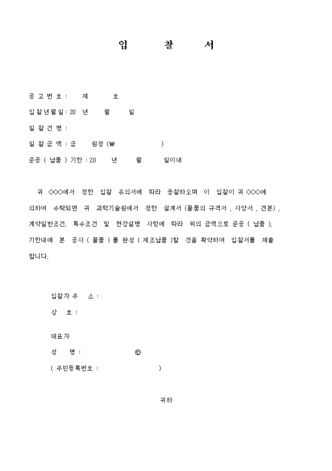 9,000원/월당원에서 정한 설계서 계약일반조건,특수조건 및 현장설명 사항에 따라 위의 금액으로 준공(납품),기한내에 본 공사(물품)를 완성(제조납품)할 것을 확약한다는 내용의 입찰서입니다.