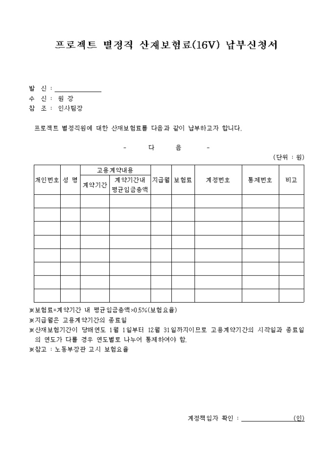 프로젝트 별정직 산재보험료(16V) 납부신청서