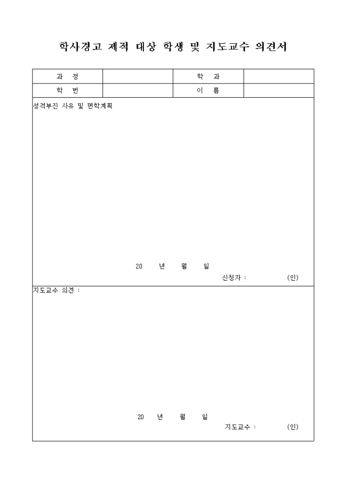 성적부진 사유 및 면학계획을 기로갛는 학사경고제적대상학생및지도교수의견서입니다.